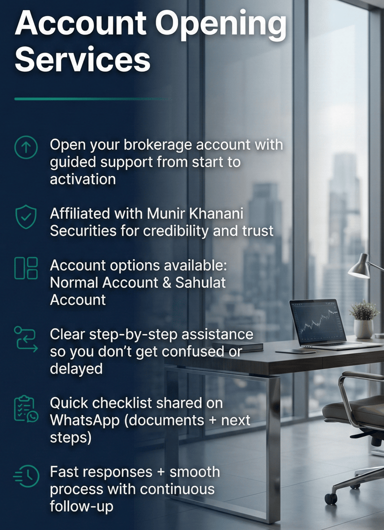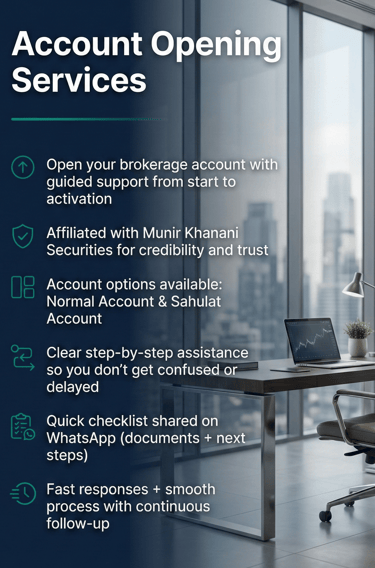 Open your brokerage account with guided, step-by-step support from start to activation. Choose between Normal and Sahulat accounts, get a quick WhatsApp checklist, and enjoy fast responses for a smooth, hassle-free process.